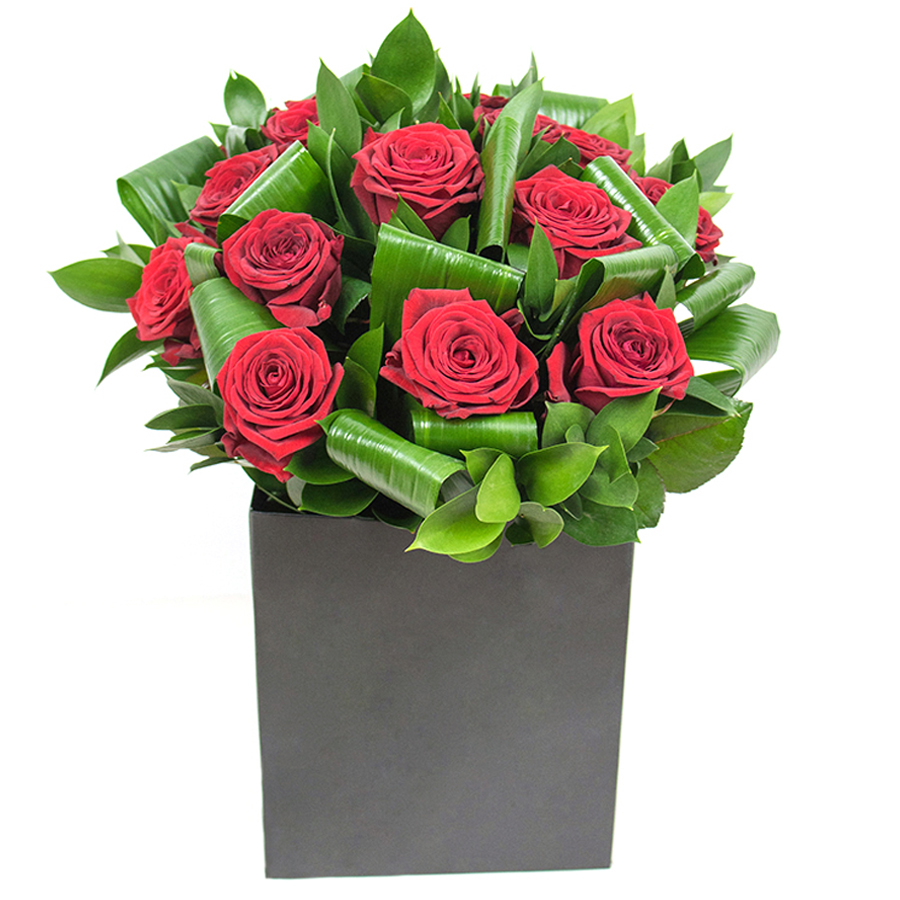 Celebrate elegance with our refined red rose bouquet. This beautiful arrangement showcases vibrant red roses blended with aspidistra leaves and ruscus, offering a unique and stylish floral display.