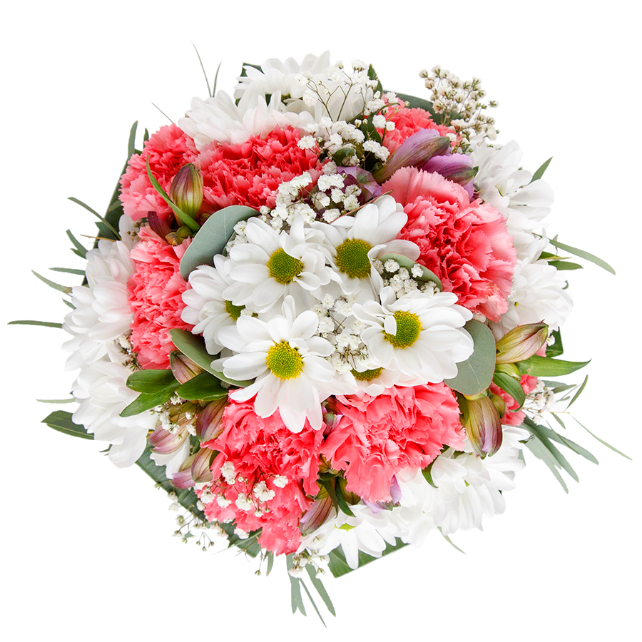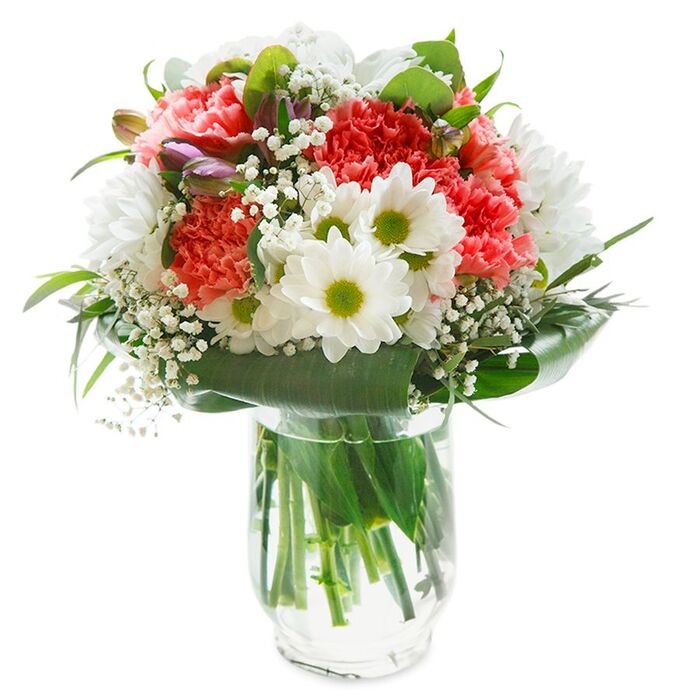 Discover the magic of our seasonal bouquet—a refined blend of nature’s finest. This stunning arrangement features the purity of white chrysanthemums, the delicate allure of gypsophila, and the subtle romance of light pink carnations, enhanced by the deep green of aspidistra leaves. All components are hand-selected for their premium quality and freshness, offering a 5-day freshness guarantee that lets you enjoy enduring beauty.
